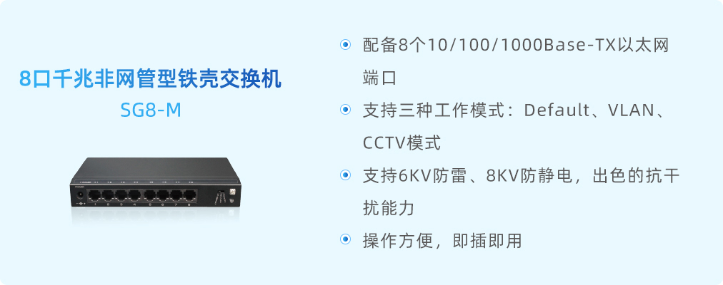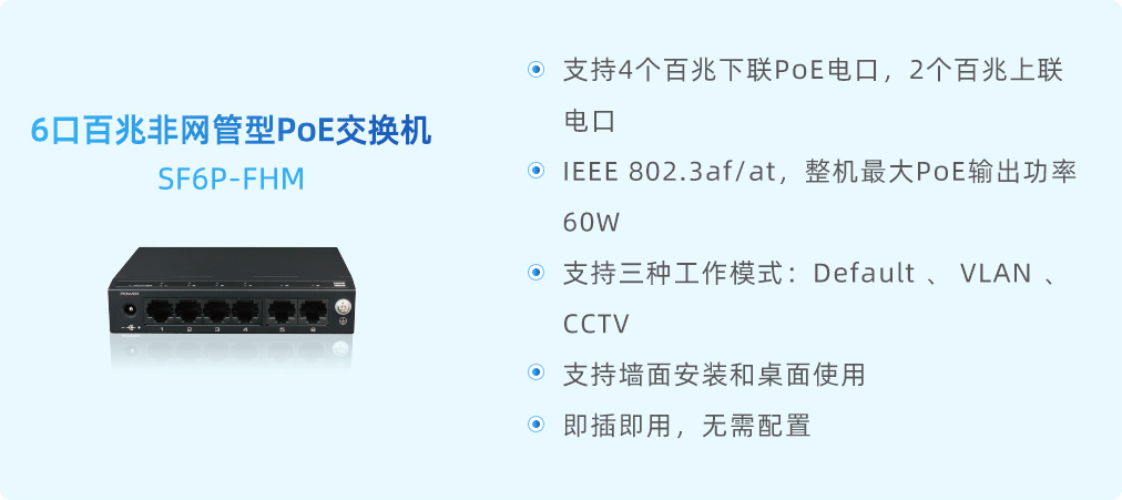 該系列交換機支持Default、VLAN(虛擬局域網(wǎng))和CCTV三種工作模式,這種多樣化的工作模式為用戶提供了極大的靈活性和便捷性。Default模式所有端口均可自由通信,適用于簡單網(wǎng)絡(luò)環(huán)境,無需復雜配置即可快速搭建;VLAN模式下聯(lián)端口相互隔離,但可與上聯(lián)端口通信,能夠有效隔離不同部門的網(wǎng)絡(luò)流量,提升網(wǎng)絡(luò)的安全性和管理效率;而CCTV模式則是針對安防監(jiān)控系統(tǒng)的特殊需求定制,通過一鍵設(shè)置即可將下聯(lián)端口速率調(diào)整為10M,并延長最遠傳輸距離至250米,這一特性尤其適合大規(guī)模、遠距離的監(jiān)控網(wǎng)絡(luò)部署。