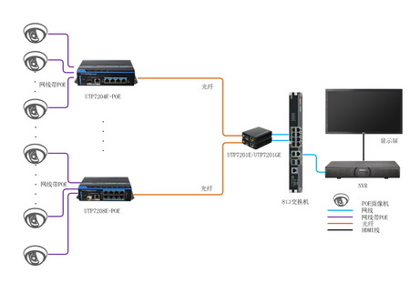 下圖顯示了這個(gè)網(wǎng)絡(luò)高清監(jiān)控的傳輸方案,主要應(yīng)用到了優(yōu)特普“網(wǎng)電速聯(lián)”產(chǎn)品:4口和8口PoE網(wǎng)絡(luò)交換機(jī)進(jìn)行數(shù)據(jù)交換和電/光轉(zhuǎn)換。