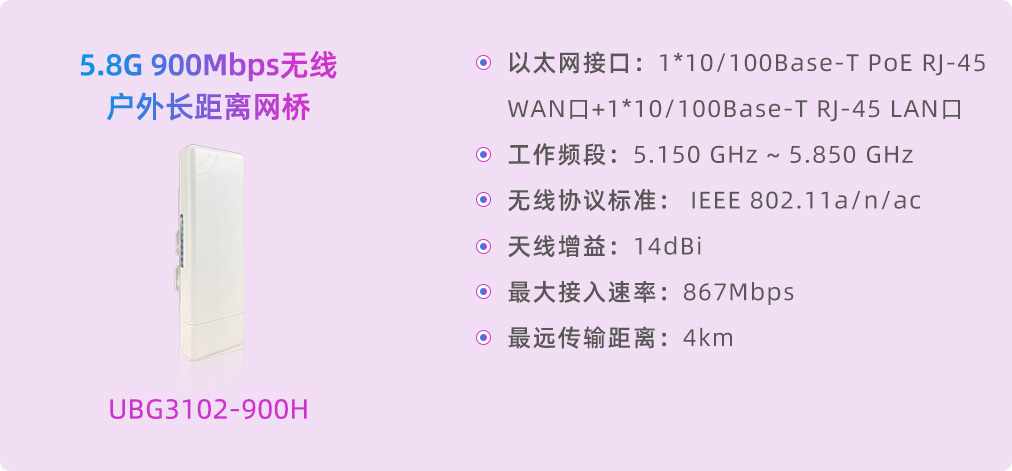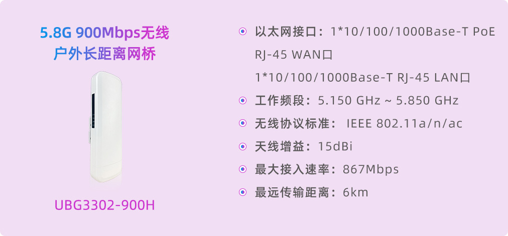 無線網(wǎng)橋作為現(xiàn)代通信技術(shù)的佼佼者,專為視頻監(jiān)控與無線接入打造,已在多領(lǐng)域展現(xiàn)獨(dú)特優(yōu)勢(shì)與廣闊前景。通過集成高增益定向天線,它突破了傳統(tǒng)線纜限制,提供高效、穩(wěn)定、可靠的遠(yuǎn)程連接方案。優(yōu)特普無線網(wǎng)橋高性能、高增益、高靈敏度、高帶寬,顯著提升無線傳輸性能與穩(wěn)定性,廣泛應(yīng)用于園區(qū)、景區(qū)、工廠、碼頭、工地及停車場等遠(yuǎn)距離數(shù)據(jù)傳輸場景。
