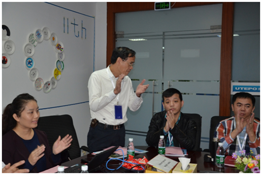 優(yōu)特普公司總經(jīng)理聶懷軍則向考察團(tuán)介紹了優(yōu)特普網(wǎng)電速聯(lián)技術(shù)在物聯(lián)網(wǎng)和智慧城市領(lǐng)域的技術(shù)創(chuàng)新及應(yīng)用,并與考察團(tuán)成員一起探討了物聯(lián)網(wǎng)技術(shù)在傳統(tǒng)制造業(yè)的應(yīng)用價值,以及網(wǎng)電速聯(lián)技術(shù)在鞋業(yè)領(lǐng)域的產(chǎn)品創(chuàng)想。