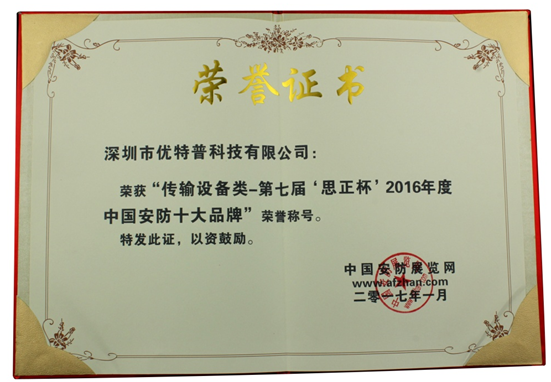 十年積淀,榮譽見證。優(yōu)特普始終堅持以“網(wǎng)電速聯(lián)匠心造,品質(zhì)問題零容忍”的品質(zhì)理念經(jīng)營企業(yè),在物聯(lián)網(wǎng)高清音視頻傳輸核心技術(shù)、創(chuàng)新產(chǎn)品、行業(yè)應(yīng)用等方面都具有絕對的競爭優(yōu)勢。一路走來,優(yōu)特普佳績不斷,本次再獲“傳輸設(shè)備類中國安防十大品牌大獎”稱號是業(yè)界對優(yōu)特普綜合實力的認(rèn)可。
