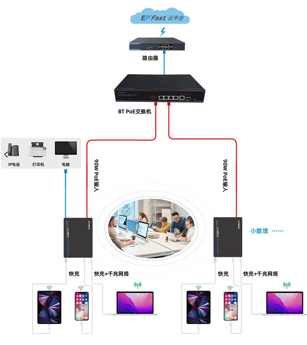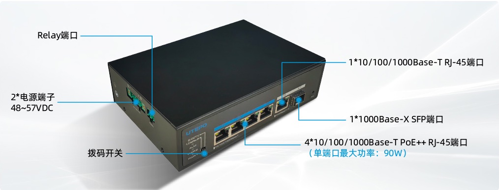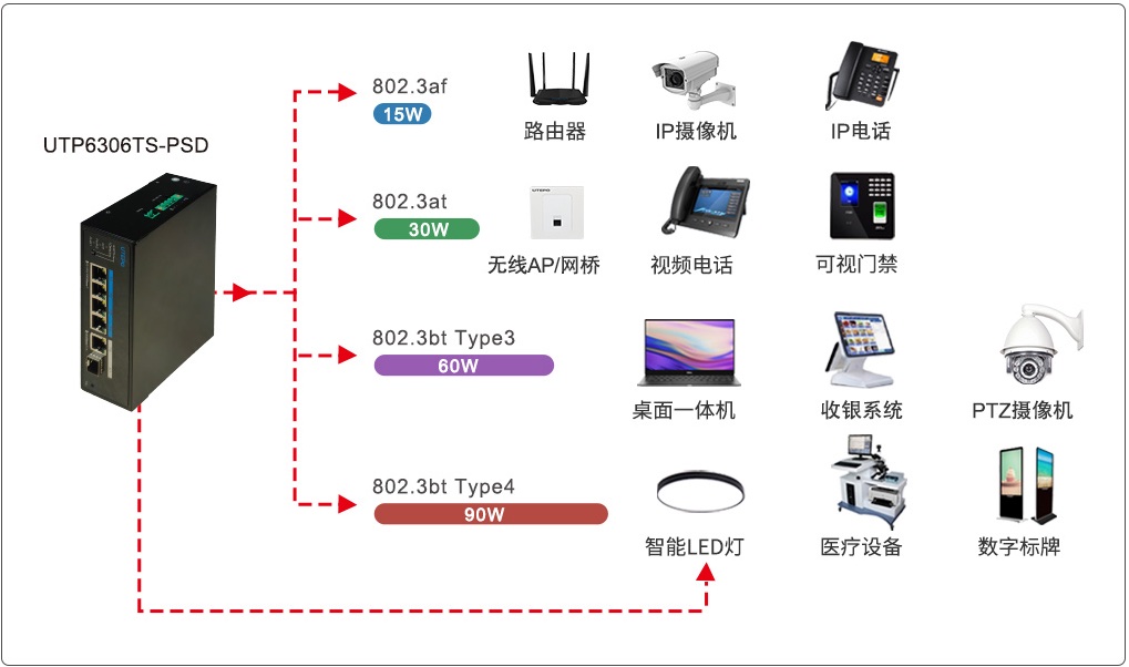 突破30W功率限制,優(yōu)特普UTP6306TS-PSD提供4個(gè)千兆bt PoE端口,可為大功率設(shè)備提供最大90W的功率并傳輸數(shù)據(jù),如照明、一體機(jī)、AI高速攝像機(jī)、工業(yè)傳感器等。同時(shí),UTP6306TS-PSD提供1個(gè)千兆以太網(wǎng)RJ-45 和1個(gè)千兆以大網(wǎng) SFP 上聯(lián)端口以滿足不同傳輸需求。