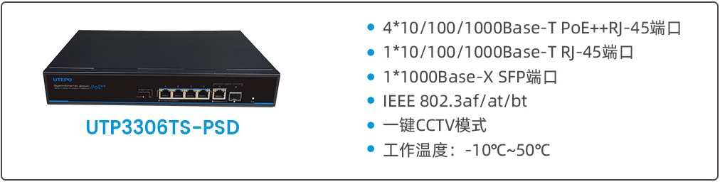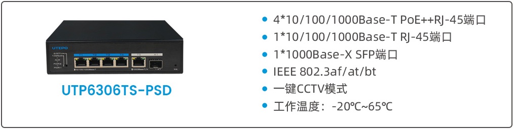 為滿足大功率設(shè)備對(duì)PoE供電的需求,優(yōu)特普最新推出了4口bt PoE全千兆工業(yè)級(jí)交換機(jī)UTP6306TS-PSD。該交換機(jī)提供4個(gè)千兆bt PoE端口、1個(gè)千兆以太網(wǎng)RJ-45 和1個(gè)千兆以大網(wǎng) SFP 上聯(lián)端口。支持IEEE 802.3af/at/bt標(biāo)準(zhǔn),每個(gè)PoE端口可為PD設(shè)備提供90W的最大功率,擺脫了智能網(wǎng)絡(luò)設(shè)備可用功率限制,可廣泛應(yīng)用于智慧交通、智慧照明、安防監(jiān)控、企業(yè)園區(qū)等領(lǐng)域。