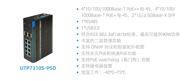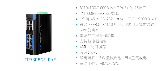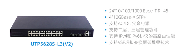 ● 后端管理:在指揮中心,采用優(yōu)特普28口千萬混合三層管理型交換機 UTP5628S-L3(V2) 來處理從前端采集的大量數(shù)據(jù)。這種完全管理型的交換機提供了高交換容量,支持豐富的二層、三層管理功能,包含VSF堆疊功能,線速L2/L3轉(zhuǎn)發(fā)和IPv4和IPv6協(xié)議的高路由性能等,在可用性、可擴展性、安全性和能源效率方面具有良好的優(yōu)勢。