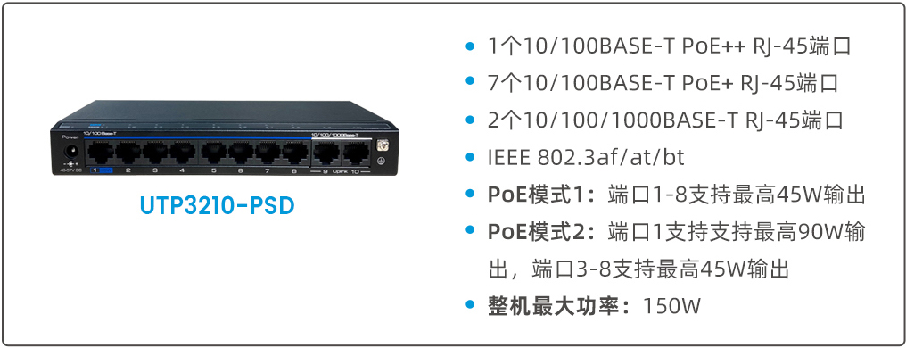 UTP3210-PSD每個(gè)端口可提供最大45W的功率輸出,可通過撥碼開關(guān)設(shè)置為端口1提供最大90W的功率輸出,同時(shí)關(guān)閉端口2的PoE功能,端口3~8單口提供最大45W的功率輸出。