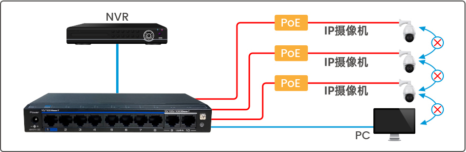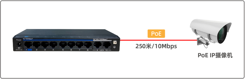 CCTV:下聯(lián)端口速率降為10M,最遠(yuǎn)傳輸距離延長(zhǎng)至250米。該模式下支持PoE看門狗功能。