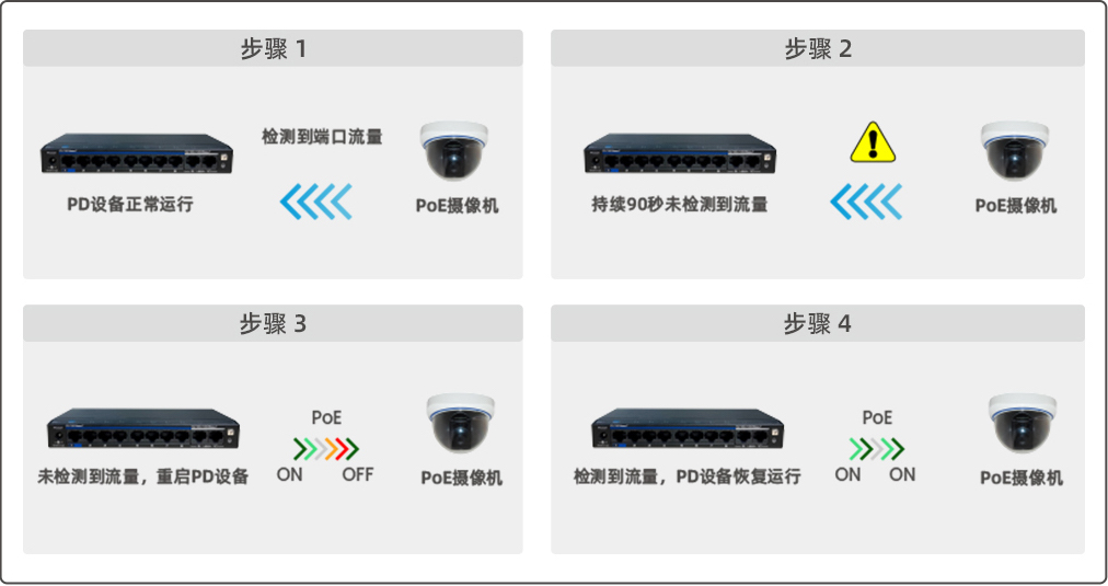 支持PoE看門狗功能(僅VLAN和CCTV模式下),實(shí)現(xiàn)PoE攝像機(jī)掉線自動(dòng)偵測(cè)、自動(dòng)重啟,減少系統(tǒng)維護(hù)成本。