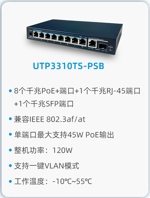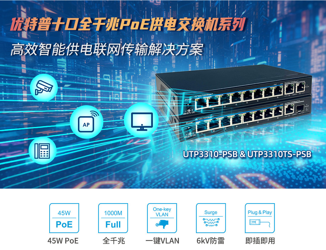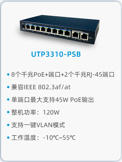 該系列交換機提供10個全千兆端口,支持高速傳輸,保障大容量數(shù)據(jù)傳輸更加穩(wěn)定,滿足多種應(yīng)用需求。其中UTP3310-PSB的上聯(lián)端口為2個千兆RJ-45端口,UTP3310TS-PSB的上聯(lián)端口為1個千兆RJ-45端口和1個千兆SFP端口。