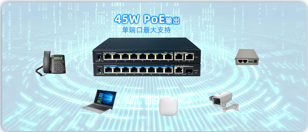 支持PoE供電,兼容IEEE 802.3af/at PoE標磚,單端口最大支持45W PoE輸出,可為無線接入點、網(wǎng)關(guān)、IP電話、監(jiān)控攝像頭等設(shè)備提供穩(wěn)定電源。
