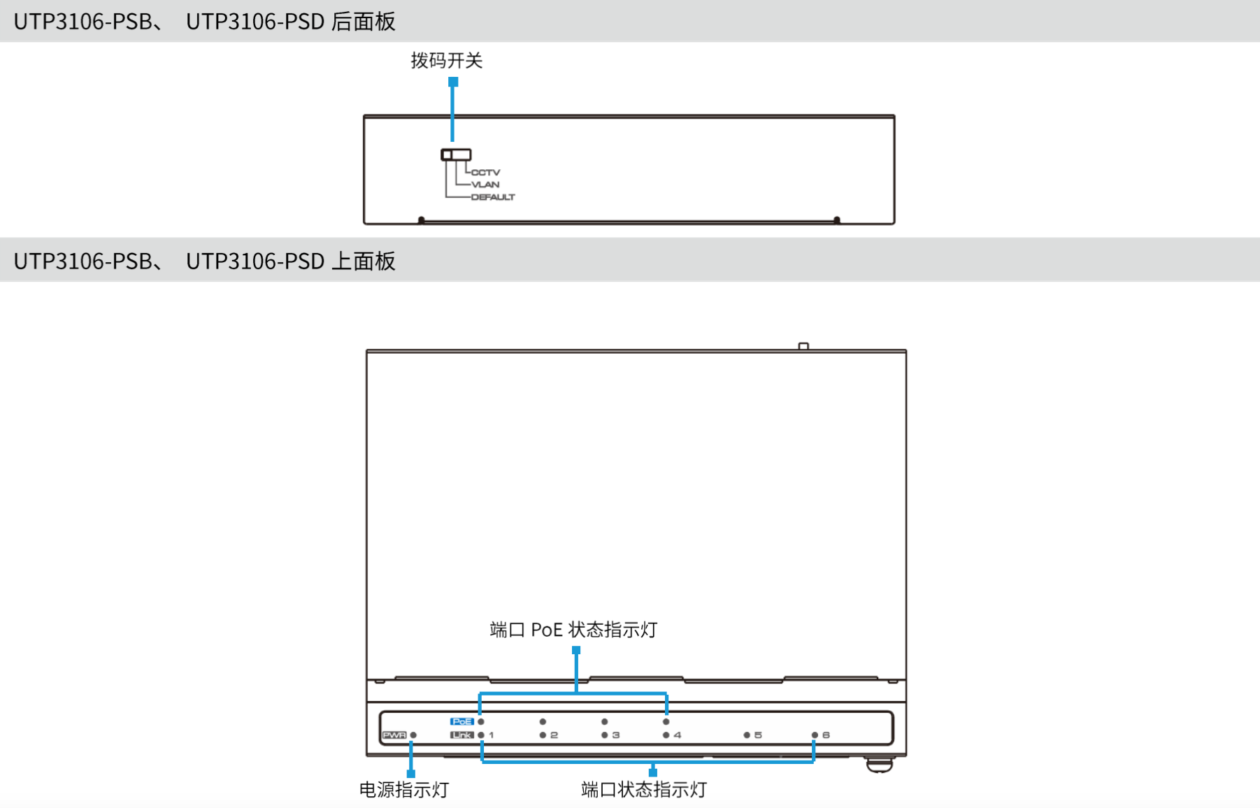 UTP3106-PSB、UTP3106-PSD交換機(jī)可提供4個(gè)百兆RJ-45以太網(wǎng)端口,2個(gè)百兆上聯(lián)RJ-45以太網(wǎng)端口。UTP3210-PSD交換機(jī)可提供8個(gè)百兆RJ-45以太網(wǎng)端口,2個(gè)千兆上聯(lián)RJ-45以太網(wǎng)端口。所有下聯(lián)RJ-45端口均支持以太網(wǎng)供電(PoE)。UTP3106-PSB交換機(jī)1~4端口單口提供最大30W的功率。UTP3106-PSD交換機(jī)1端口提供最大90W的功率,2~4端口單口提供最大45W的功率。UTP3210-PSD交換機(jī)每個(gè)端口可提供最大45W的功率,可通過撥碼開關(guān)設(shè)置為1端口提供最大 90W的功率,同時(shí)2端口關(guān)閉PoE功能,3~8端口單口提供最大45W的功率。